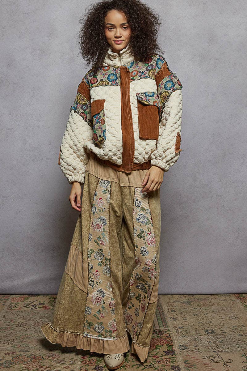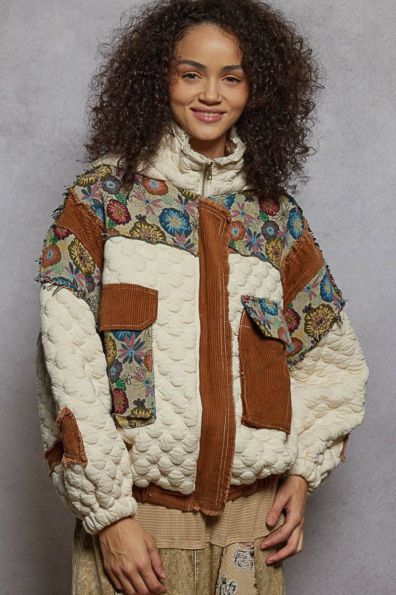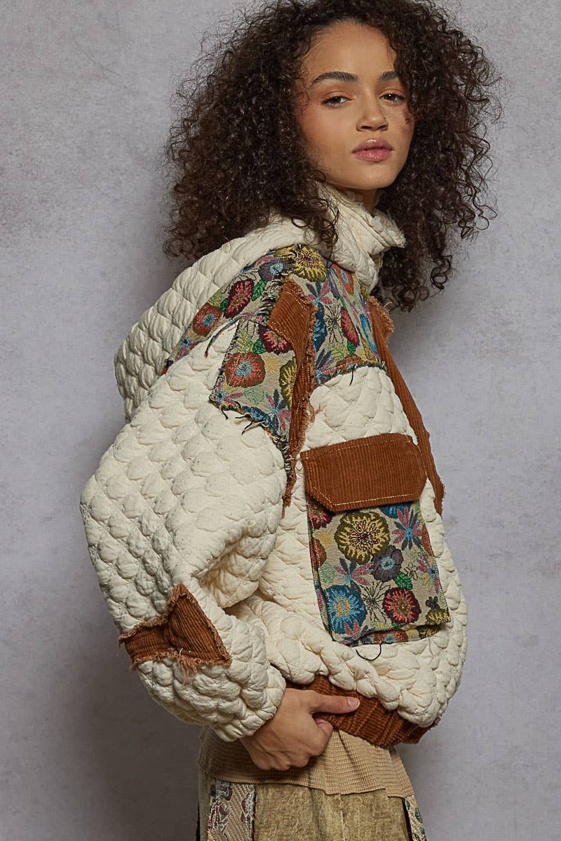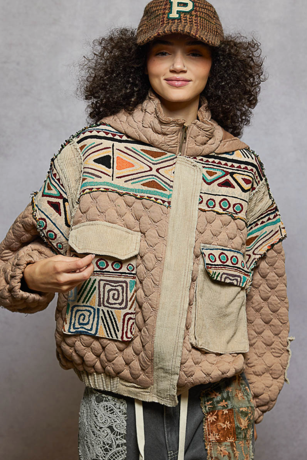 Designed in mock neck balloon sleeve roomy fit jacket in quilted with jacquard contrast.