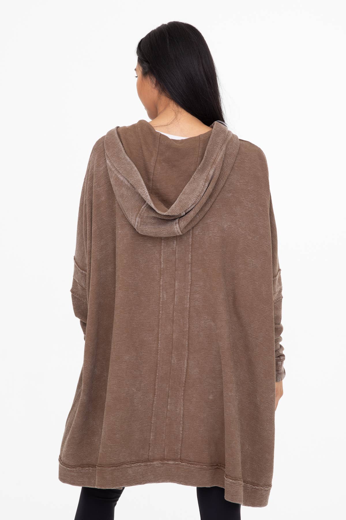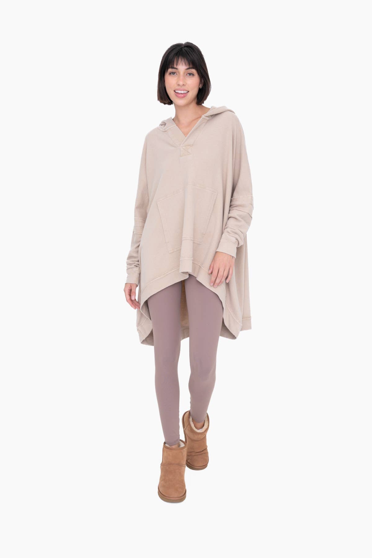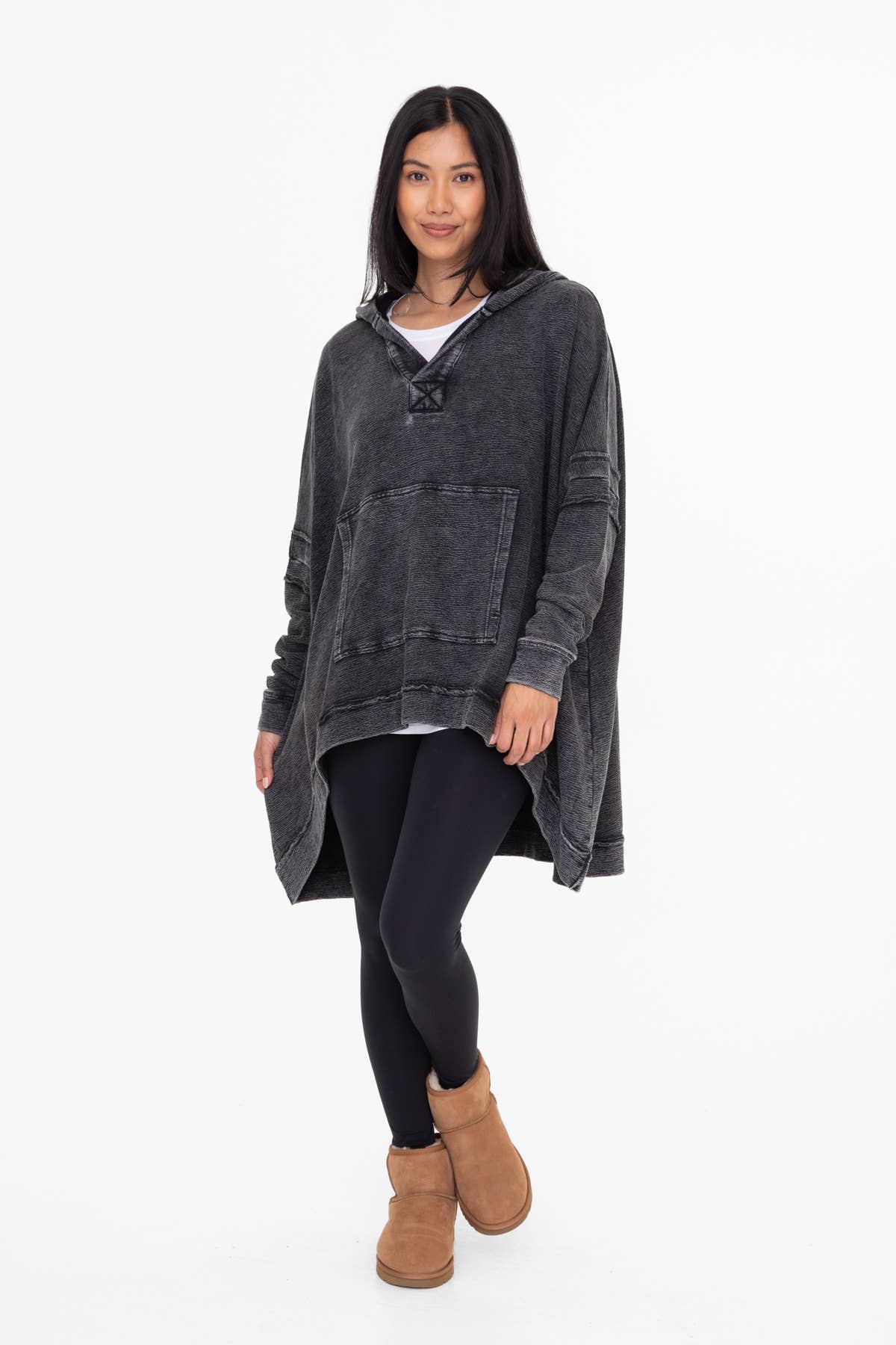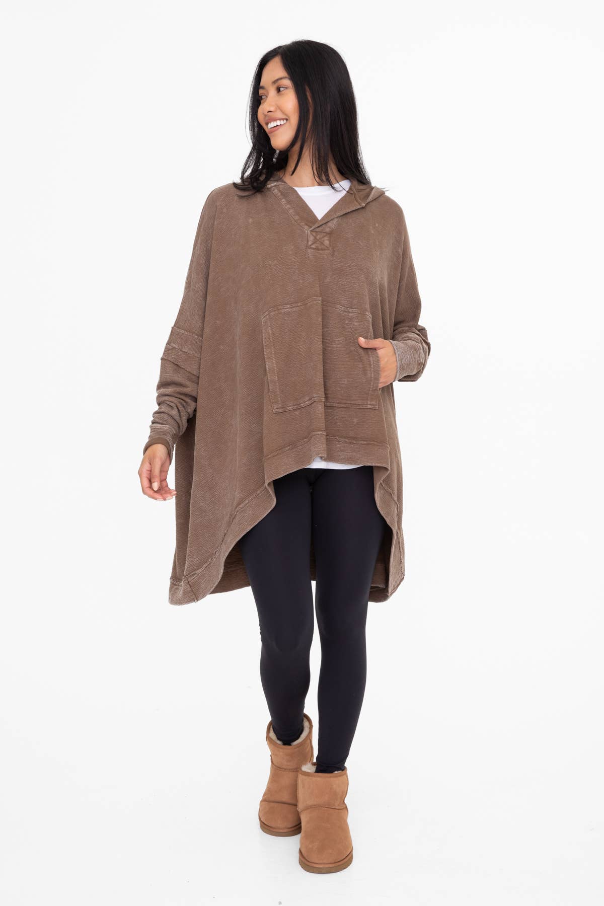 Add a cozy boho layer to your wardrobe with our oversized poncho-style hoodie. Featuring a loose fit, kangaroo pocket, textured jacquard knit fabric, raw edge details, and a high-low hem.