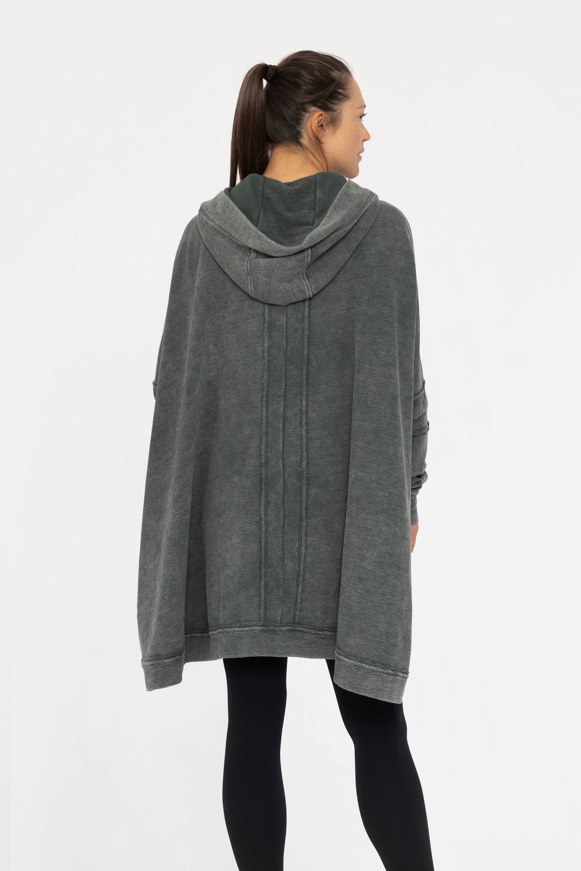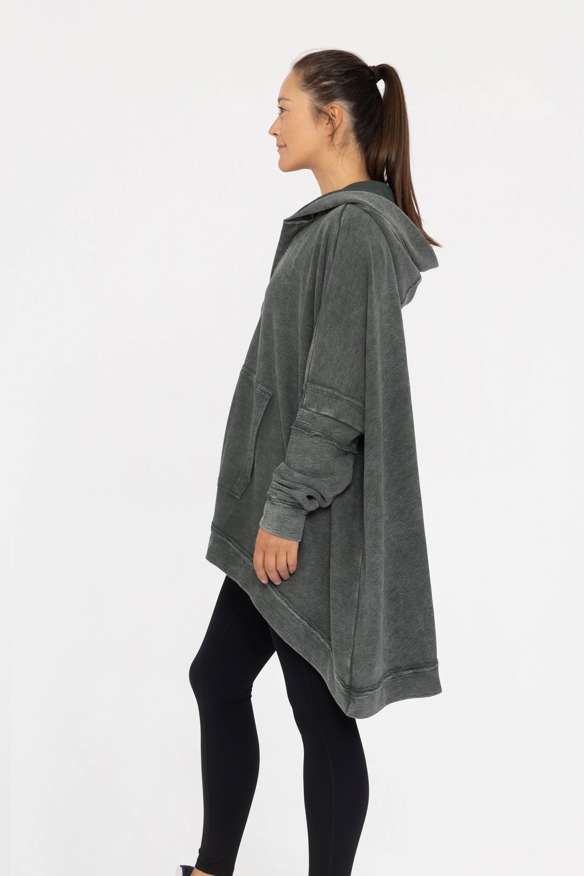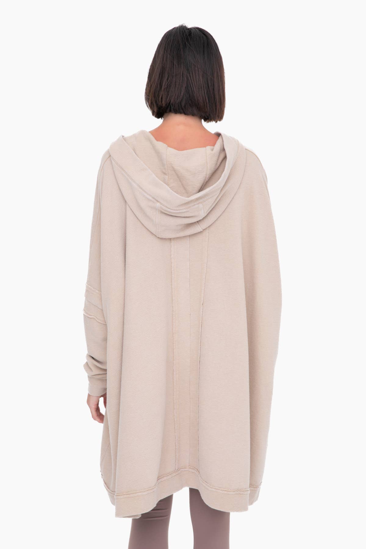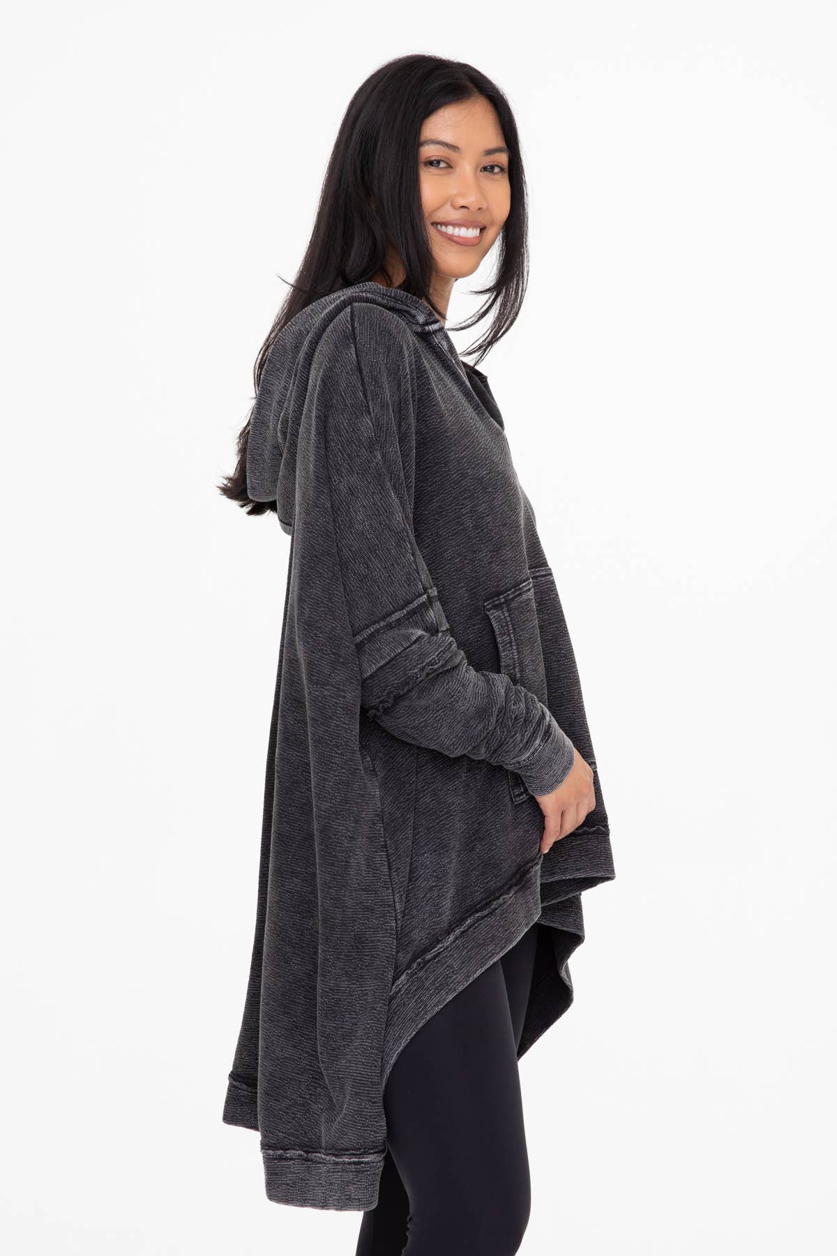 Add a cozy boho layer to your wardrobe with our oversized poncho-style hoodie. Featuring a loose fit, kangaroo pocket, textured jacquard knit fabric, raw edge details, and a high-low hem.