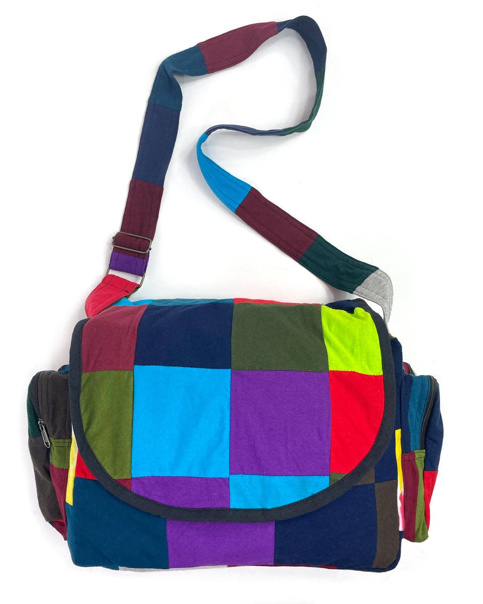 This patchwork messenger bag features side pockets, zipper closure and adjustable strap, and is made out of assorted-color patches.