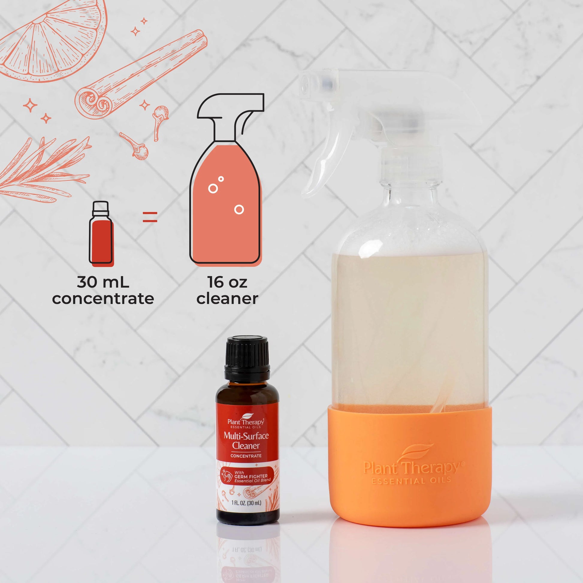 In addition to formulating a powerful, effective cleaner, Plant Therapy created a more sustainable product that helps cut down on single-use plastics. These 30 mL concentrates, paired with our 16 fl. oz. reusable glass spray bottles, are designed to eliminate the guesswork of mixing. Simply pour the entire content of one concentrate bottle into your 16 fl. oz. spray bottle, fill the rest with water, shake, and use! Plus, our reusable glass spray bottles and biodegradable concentrate further reduce the environmental impact of your cleaning products. Enjoy the amazing aroma of one of our most popular Germ Fighter Essential Oil Blend in this natural and sustainable cleaning solution, all while helping keep your family healthy and free from harsh chemicals!