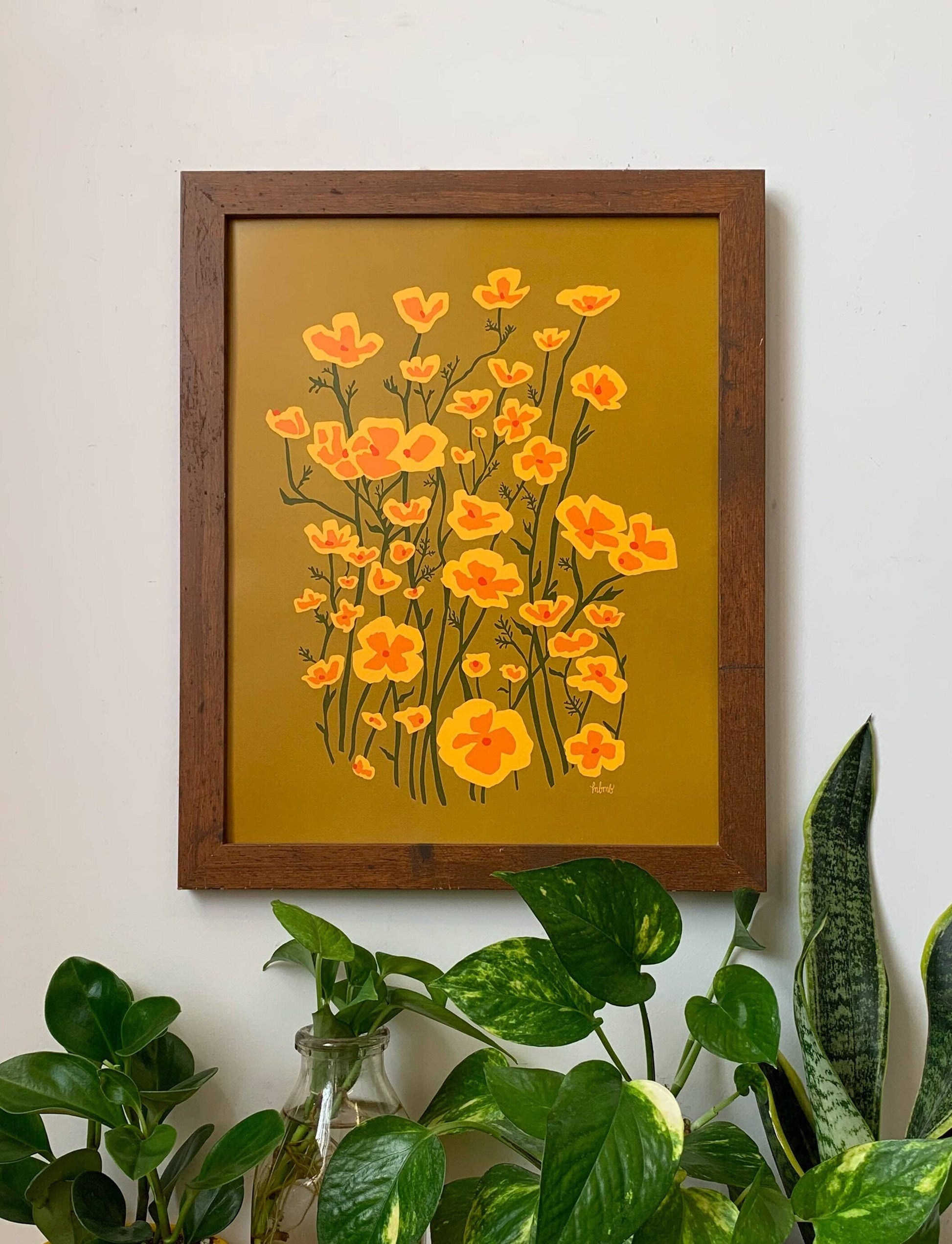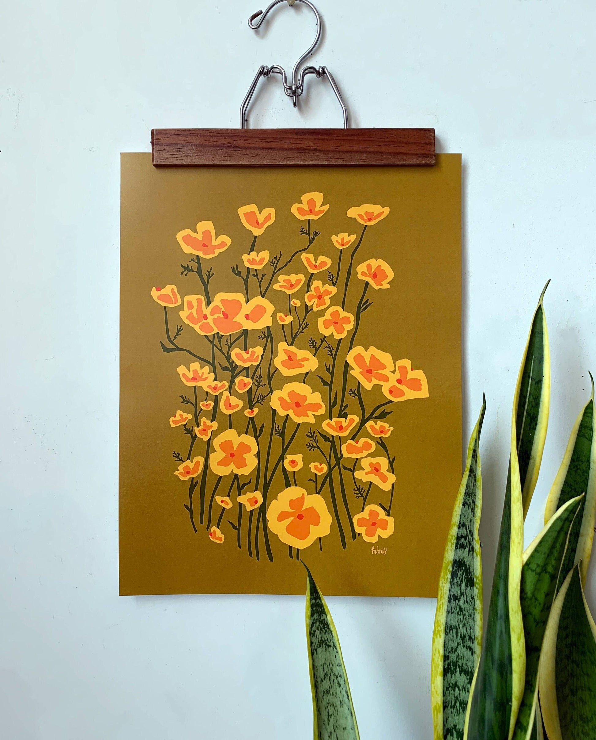 Poppies, popping as they do in gold and orange, on an ochre-y chartreuse backdrop.