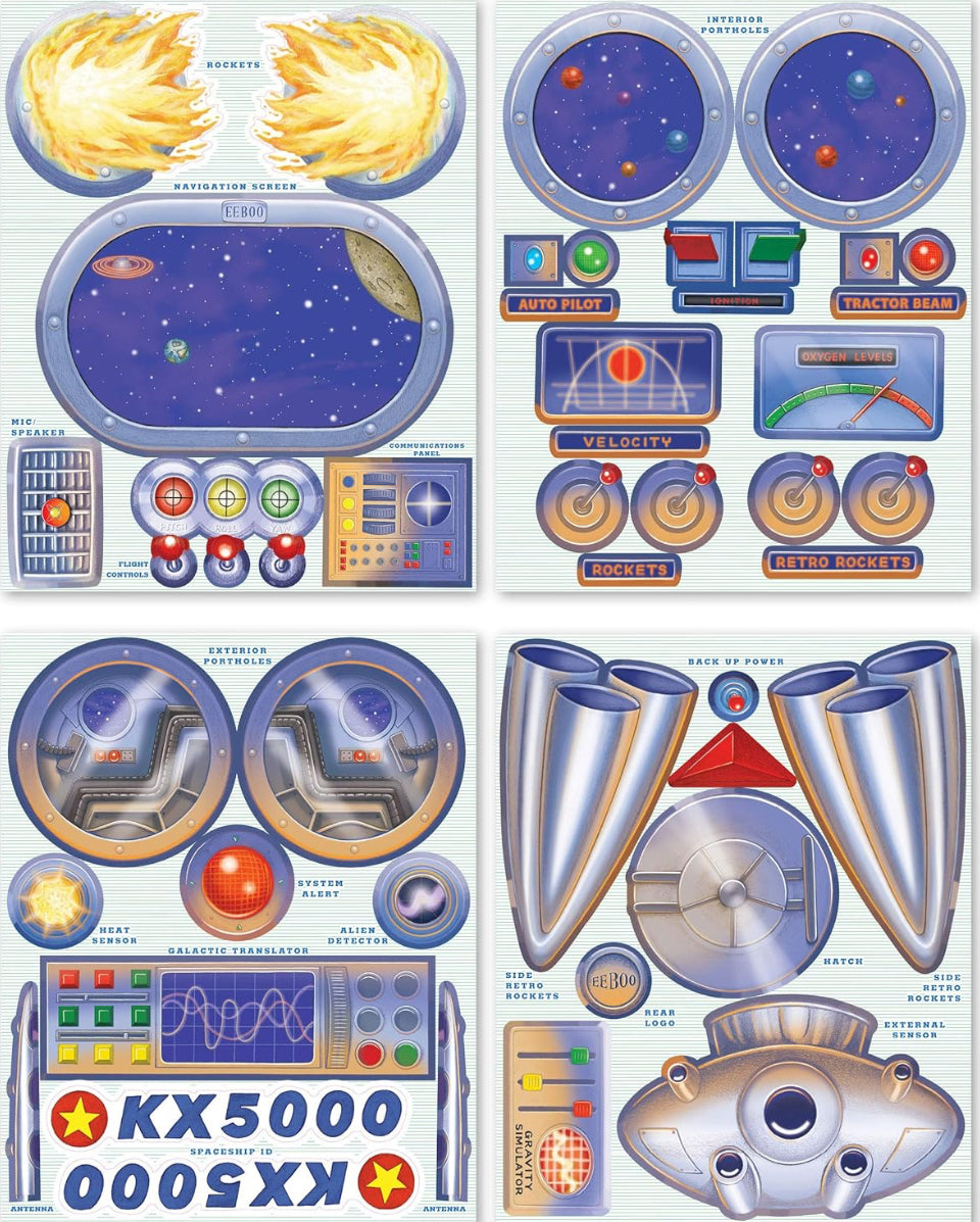 INCLUDES 4 sheets of reusable stickers that have window portals, a control panel, rockets, and more.