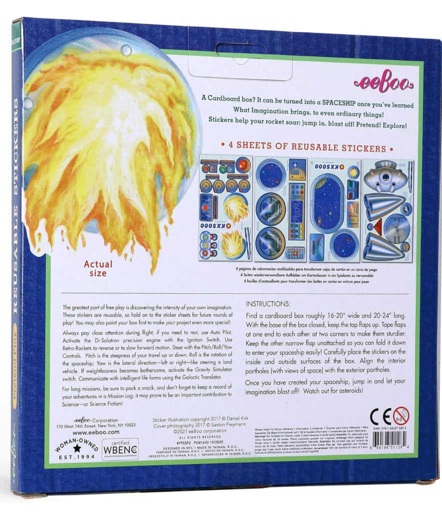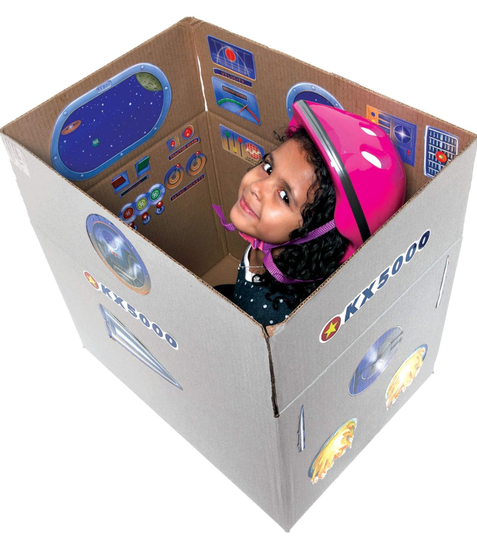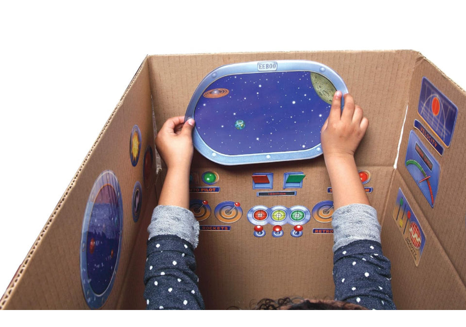 A valuable play tool for children for many generations, the cardboard box was inducted into the National Toy Hall of Fame in 2005. Now with eeBoo's Pretend Play Stickers the classic cardboard box is getting an upgrade. Recycle your own cardboard box into a kid's very own Pretend Play Spaceship.
