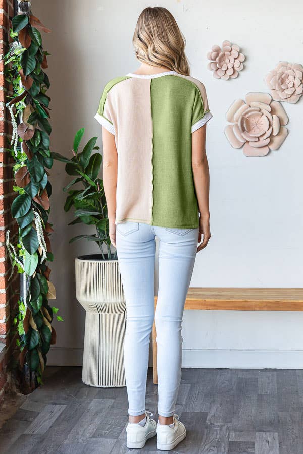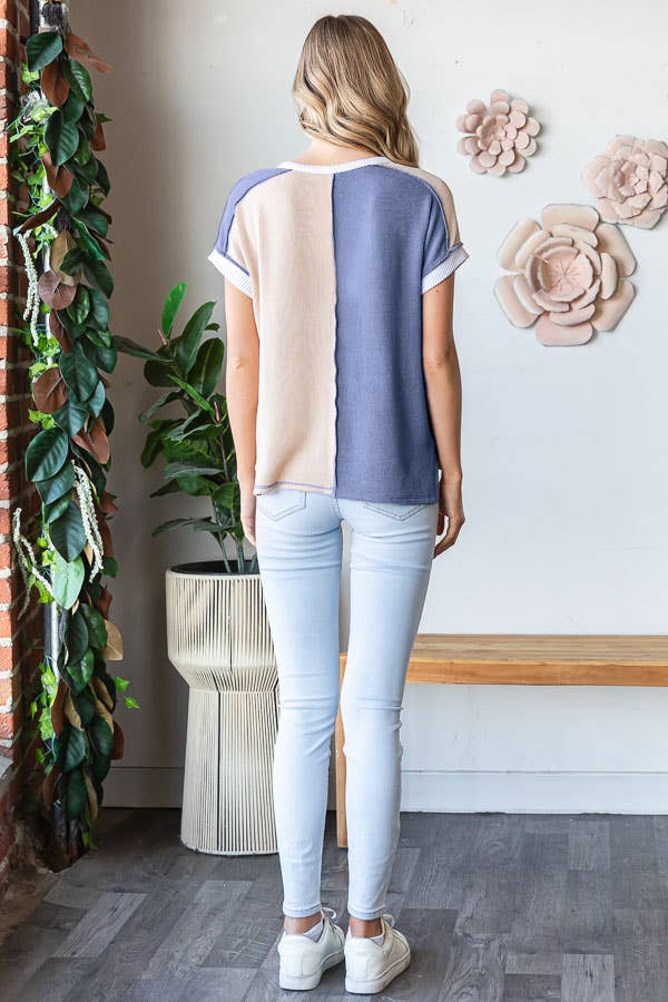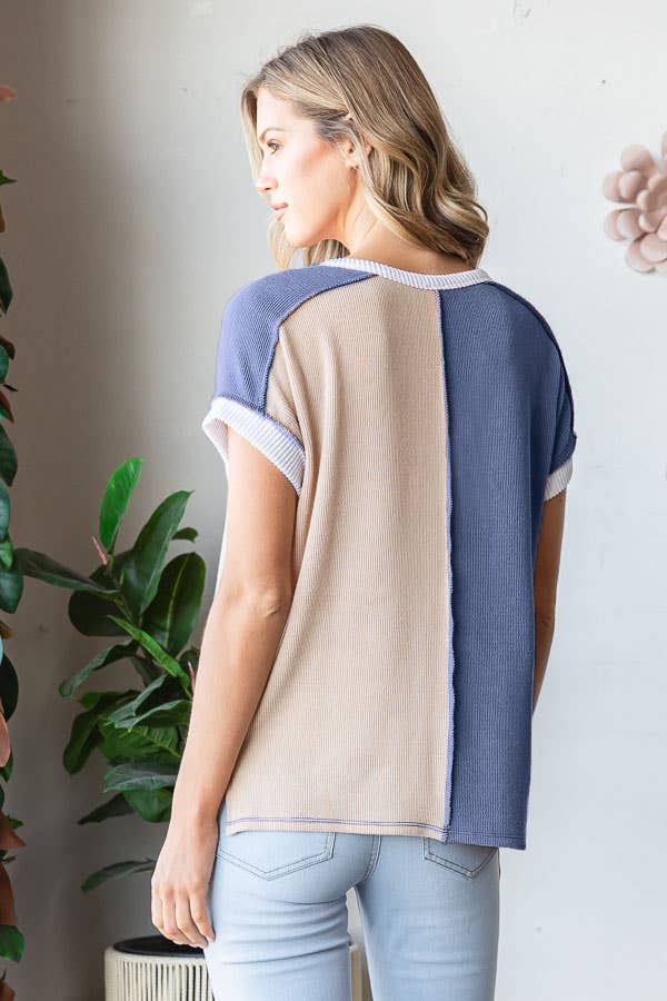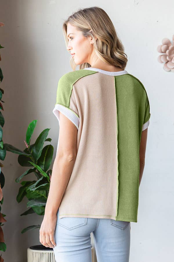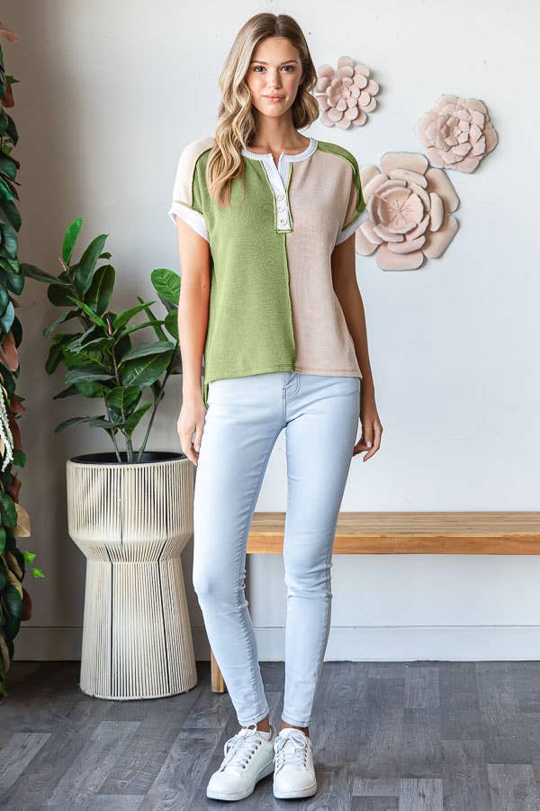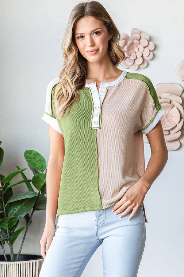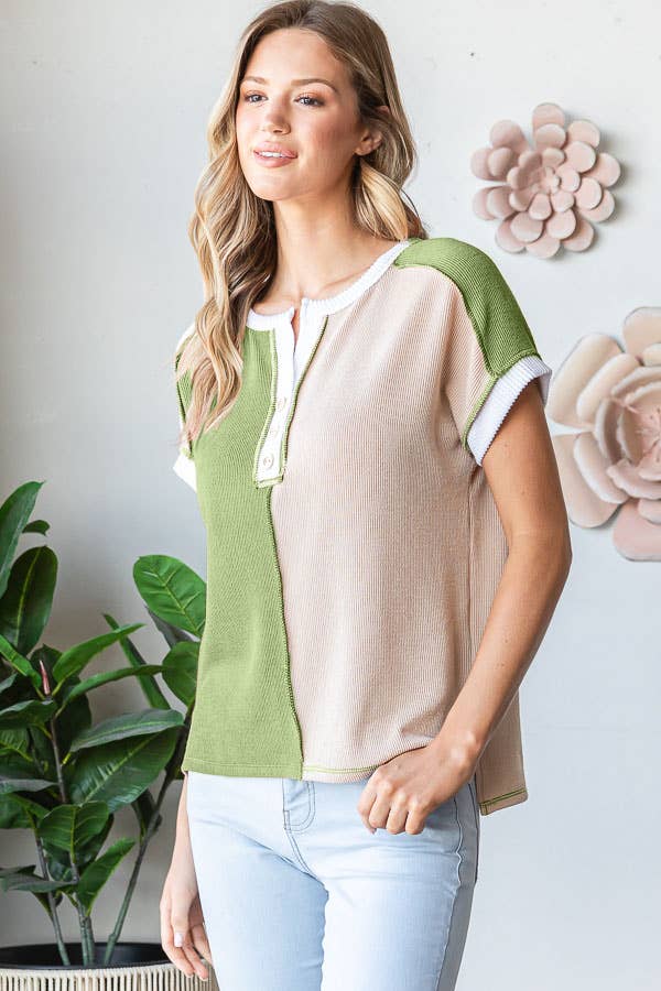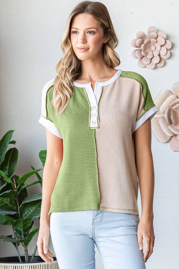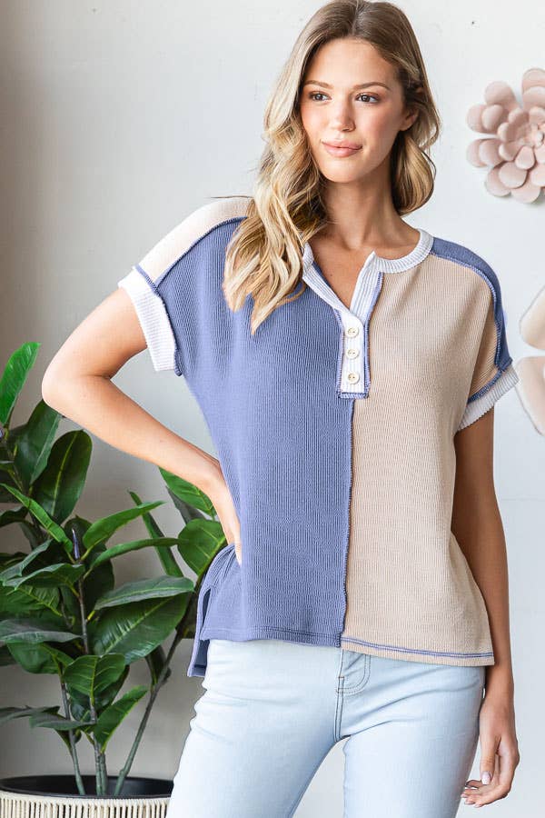 A RIBBED COLOR BLOCK TOP FEATURING A BUTTON FRONT DETAIL, ROUND NECK, SHORT BANDED SLEEVES, EXPOSED SEAMS WITH A RAW EDGE, PATCHWORK, DROP SHOULDER, HI LOW, SIDE SLITS, AND A RELAXED FIT. (EACH ONE IS UNIQUE)