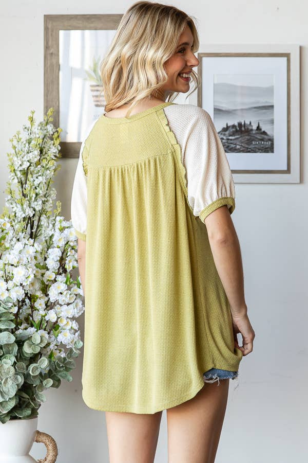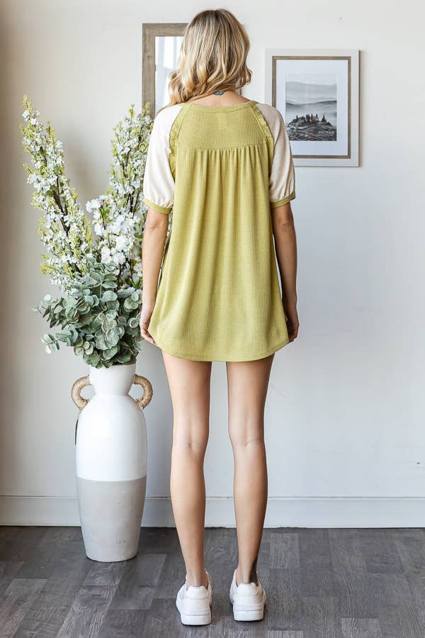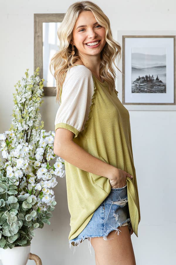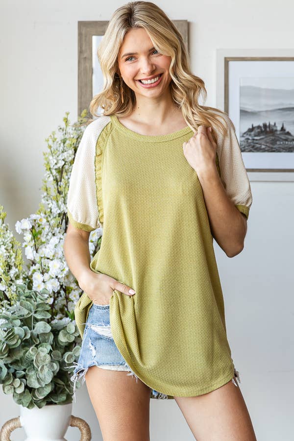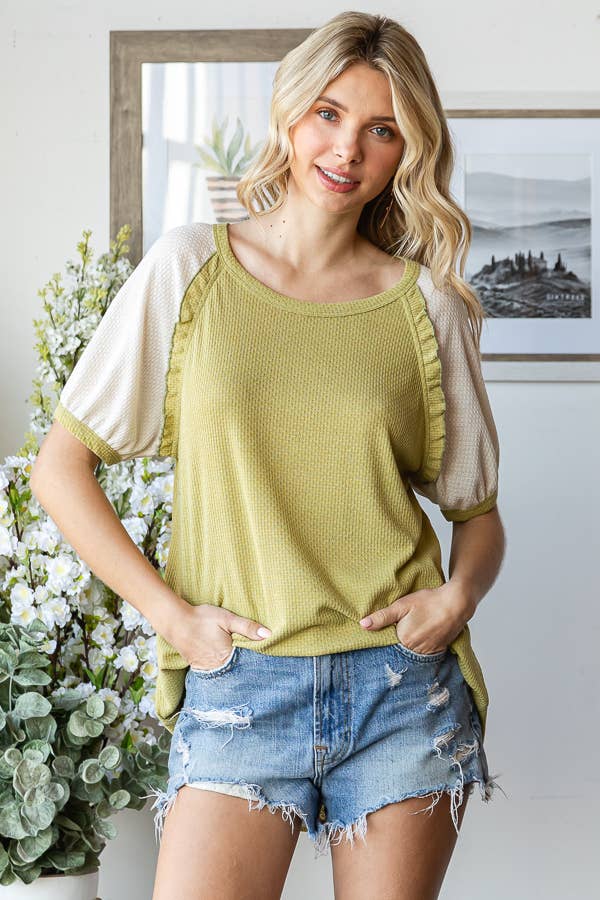 A TEXTURED COLOR BLOCK TOP FEATURING A RUFFLE DETAIL, SHORT BISHOP SLEEVES, CURVED HEM, AND A RELAXED FIT.