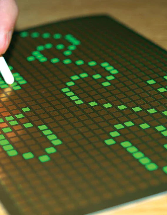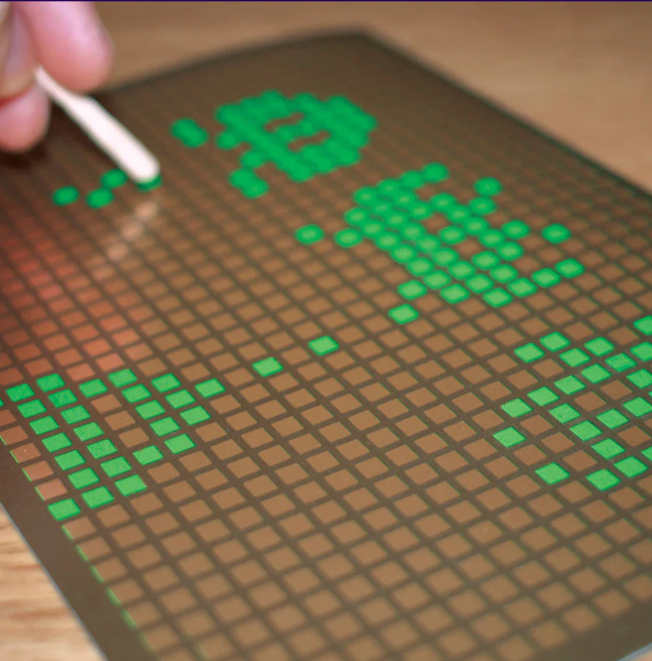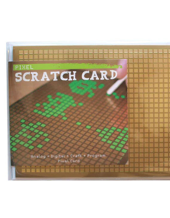 Analog and digital merge into an interactive winner. Scratch away the gold foil to reveal neon green pixels. Create your own messages and pictures!