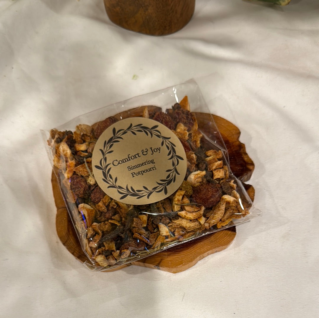 A sweet and spicy nostalgic fragrance to enhance your home environment. This in an awesome year round fragrance. I never get tired of it! We love our homes to feel cozy and if you love all the natural things, then simmering potpourri is a fabulous asset to have on hand in your kitchen cabinet. Signature Spice Simmering Potpourri Ingredients: Dried orange peel, whole cloves, cinnamon chips. All natural - no synthetic fragrances.