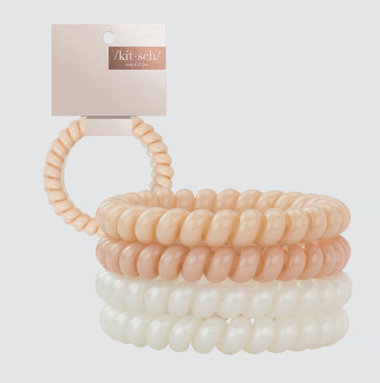 All new Slick Hair Coils by KITSCH! These hair coils hold all of your hair in place without leaving a crease or dent! Perfect for ponytail and messy bun! Each pack includes 4 large slick hair coils in Nude.