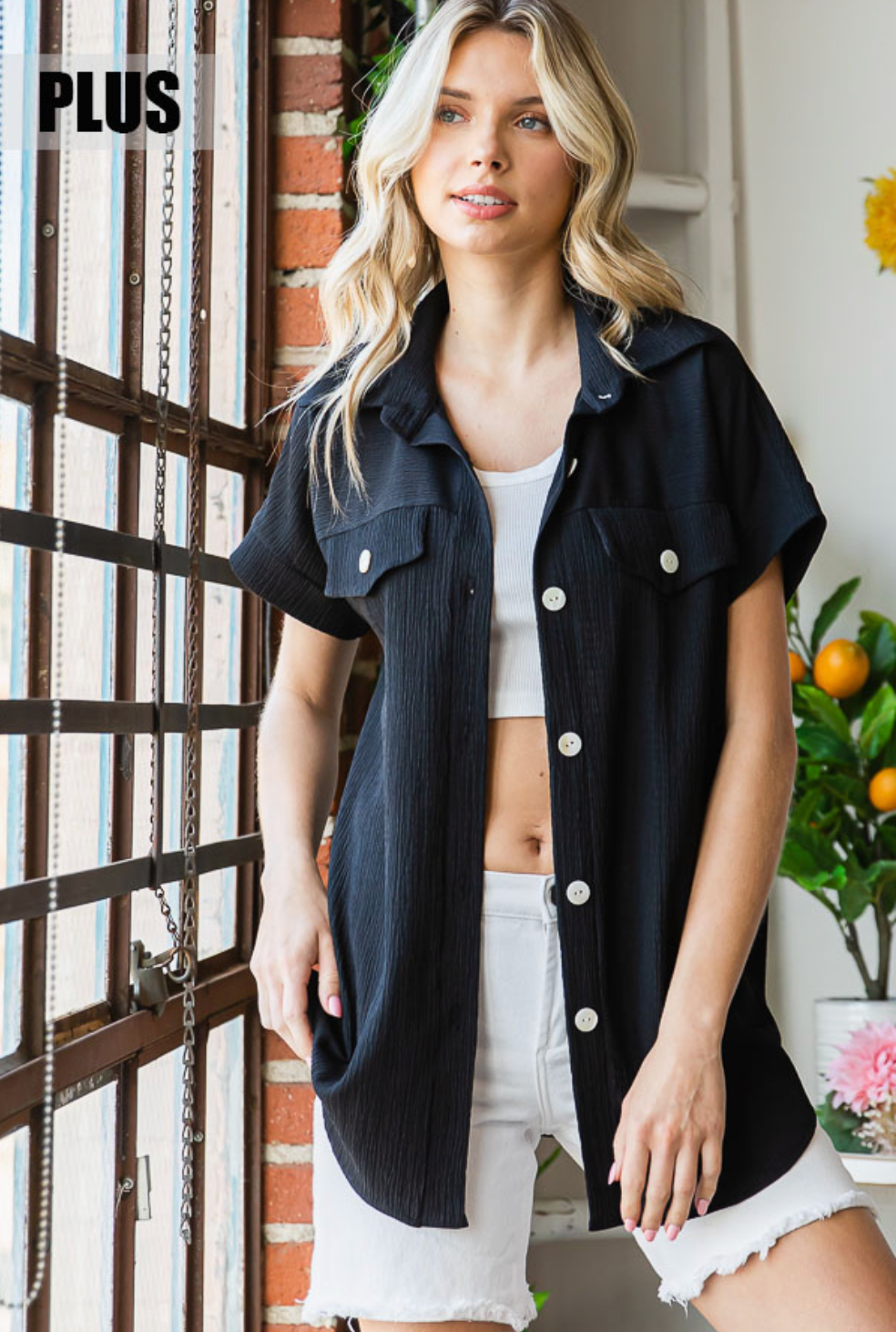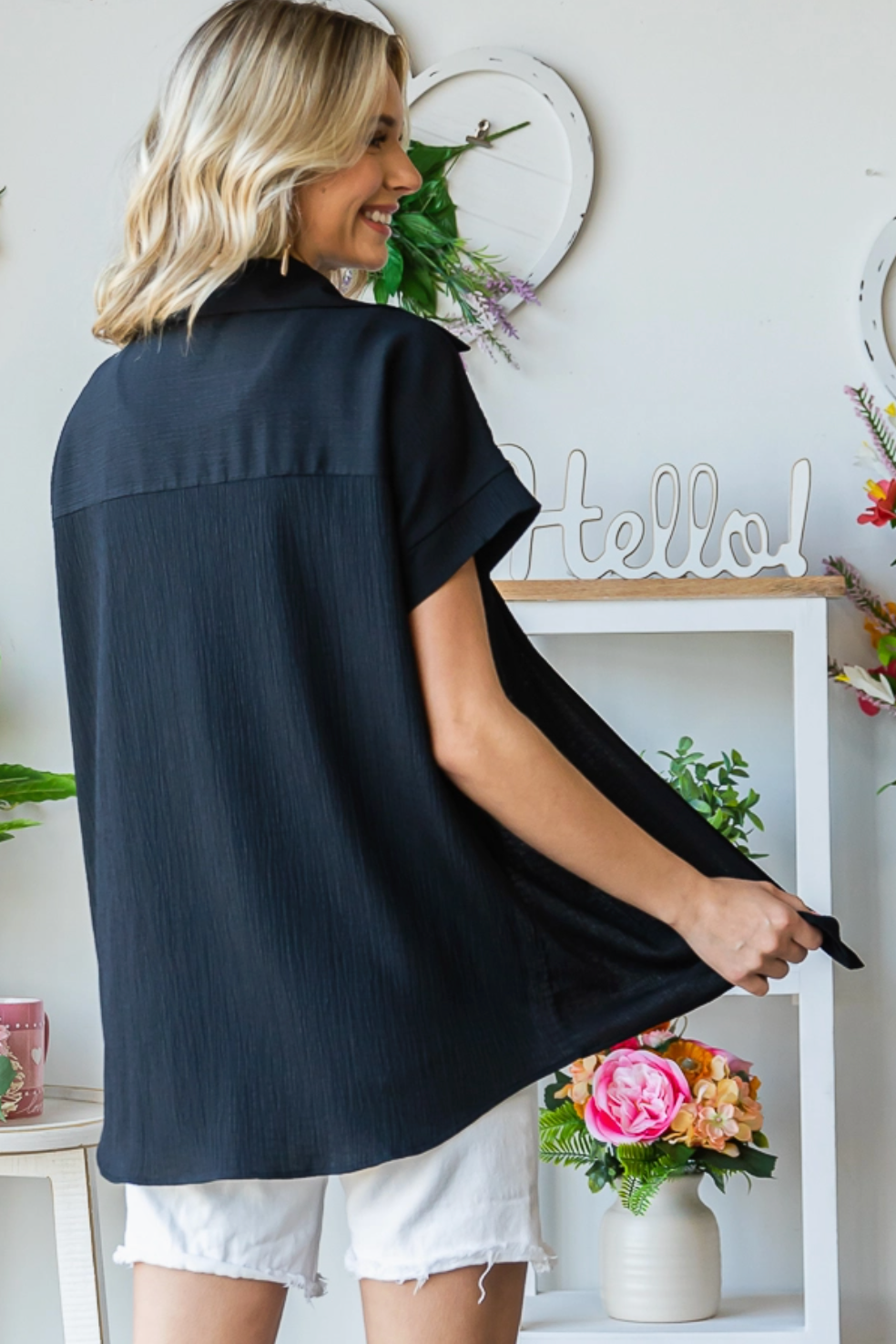 Stay stylish and comfortable in our Solid Crinkle Top. This unique top features a playful collar neck, faux double bust pockets, and a relaxed fit. With a button down design and short sleeves, this top is perfect for any casual occasion. Made in the USA with a comfortable blend of polyester and spandex fabric.