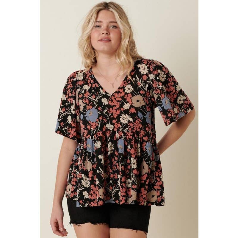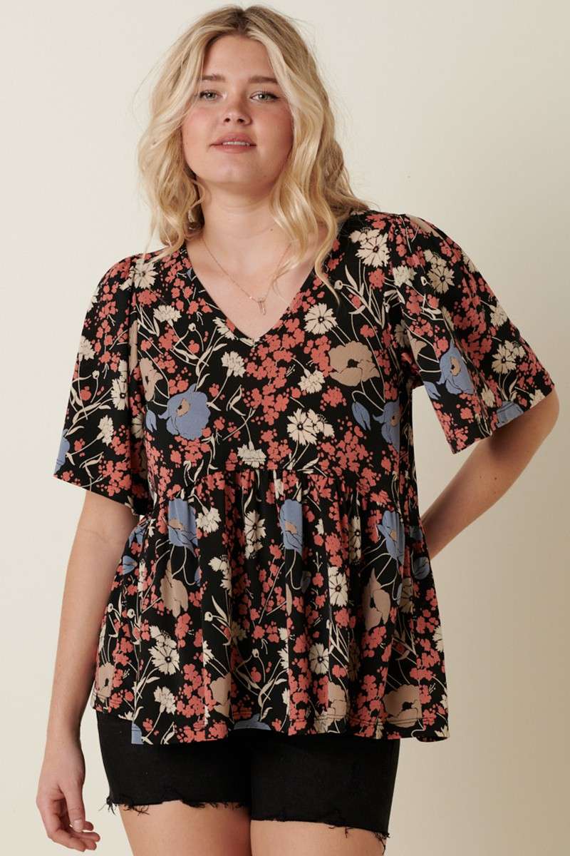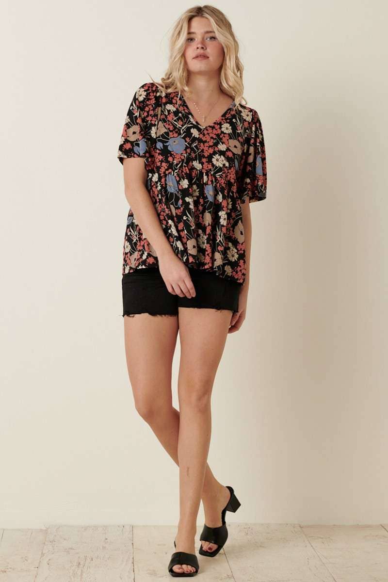 FLOWER PRINT V-NECK BABY DOLL KNIT BLOUSE