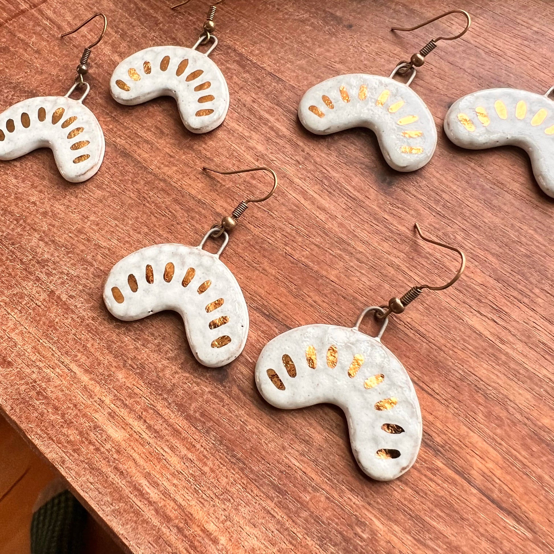 "With all of my handmade ceramic earrings I strive for what I call “Handmade Elegance”. I love creating elegant pieces of work while making sure some of their authentic handmade nature shines through. Each of these uniquely made earrings are cut from a sheet of stoneware clay, fired in a kiln, glazed and then hand painted with a 24K gold paint which is fired and fused on in the kiln as well. The 24k gold takes the texture of the glaze below usually either, matte, satin, or shiny. Due to this beautiful handmade process minor differences in earring height, color, and shape may be present. All Ear Wires will be as pictured, antiqued brass Nickel Free ear wires." - Shop Owner