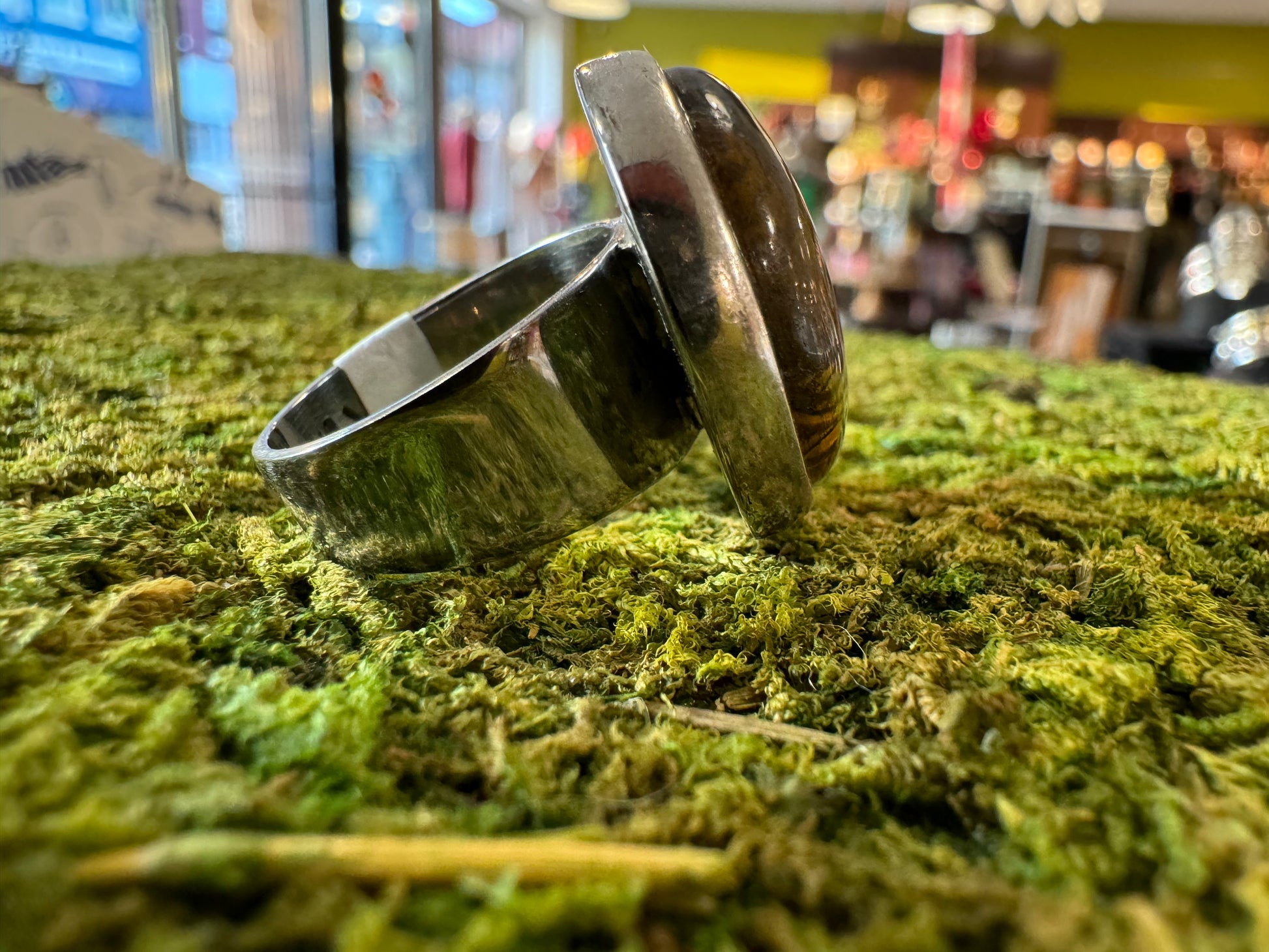 This perfectly round stone is set in a wide band, and is extra comfortable to wear.