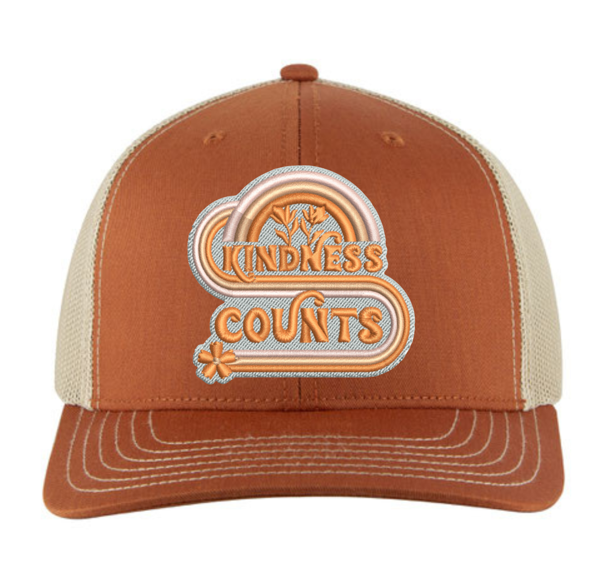 Kindness Counts Patch Brown Adult Trucker Hat is available in Rust Orange or Brown Snapback Hat.