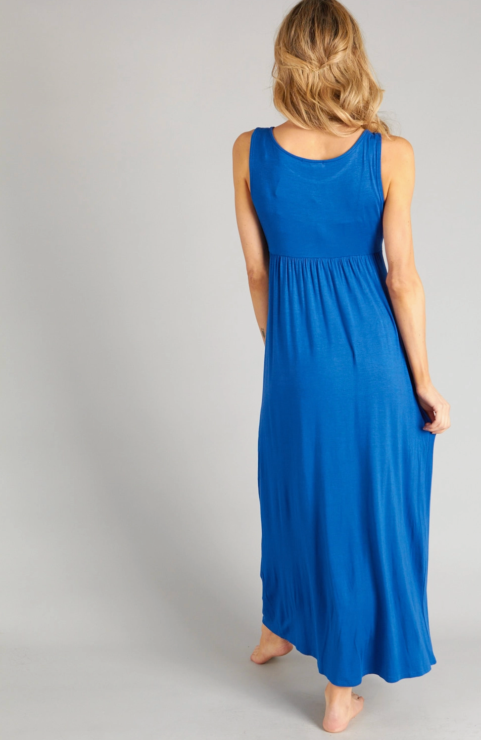 Be effortlessly chic in this USA-made maxi dress featuring a solid rayon spandex blend that will hug your curves in all the right places. With its playful maxi length and vibrant royal blue color, this dress is a must-have for any fashion-forward individual. This color looks GREAT with any skin tones or hair colors!