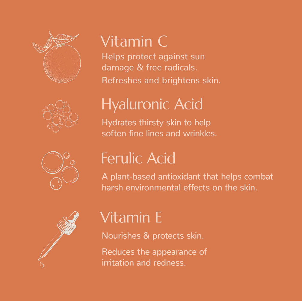 Vitamin C: A skincare favorite, Vitamin C is a powerful antioxidant that helps promote the protection of skin against sun damage and free radicals (toxins) that we come in contact with every day. It supports the appearance of rejuvenated skin by helping minimize the appearance of fine lines, wrinkles, dark spots, and blemishes.