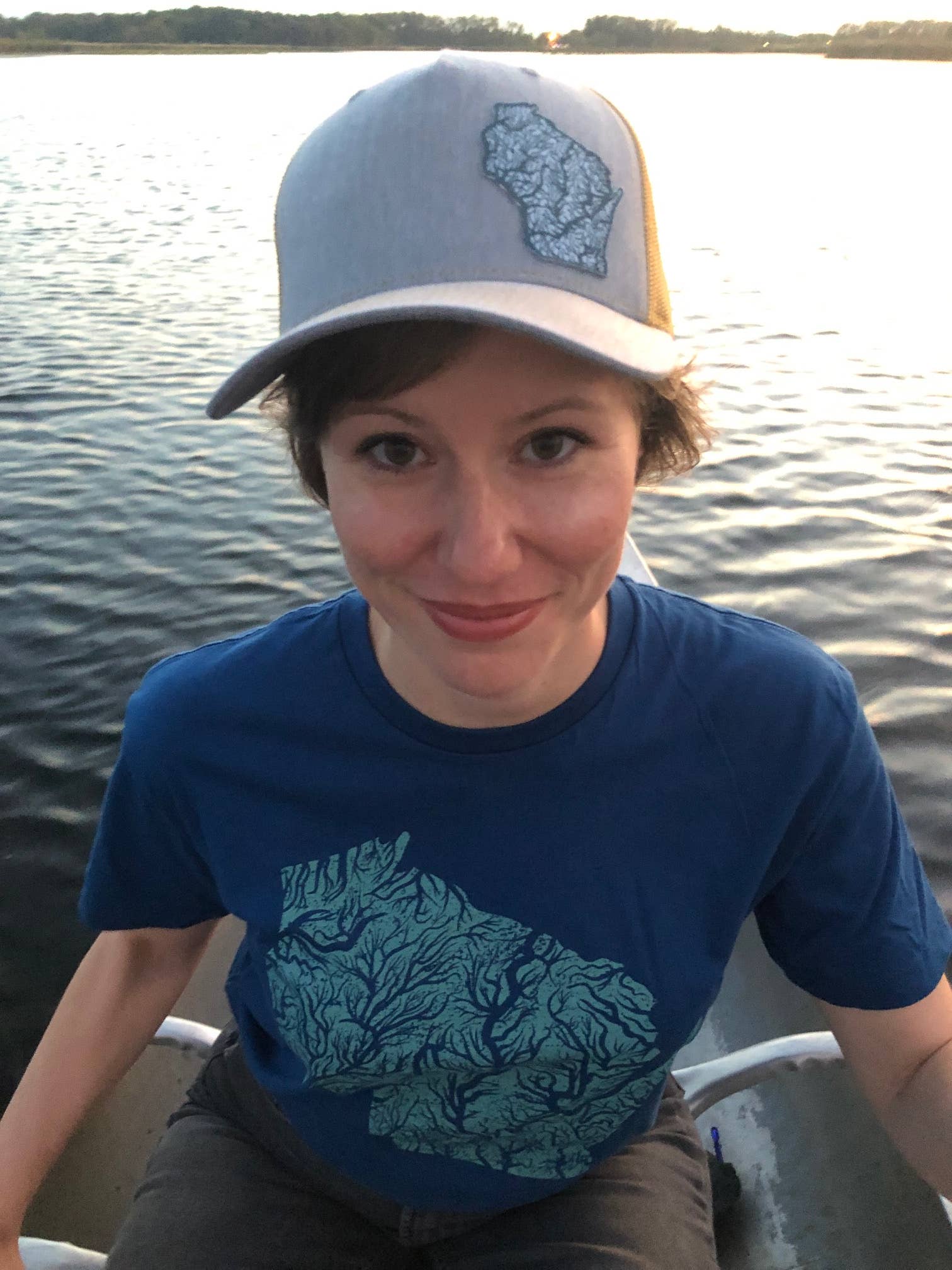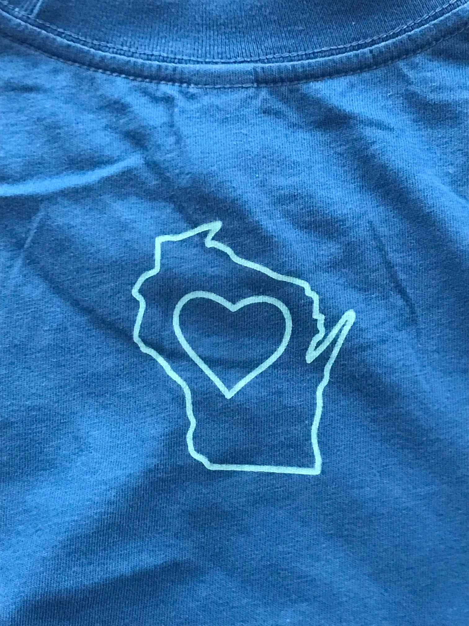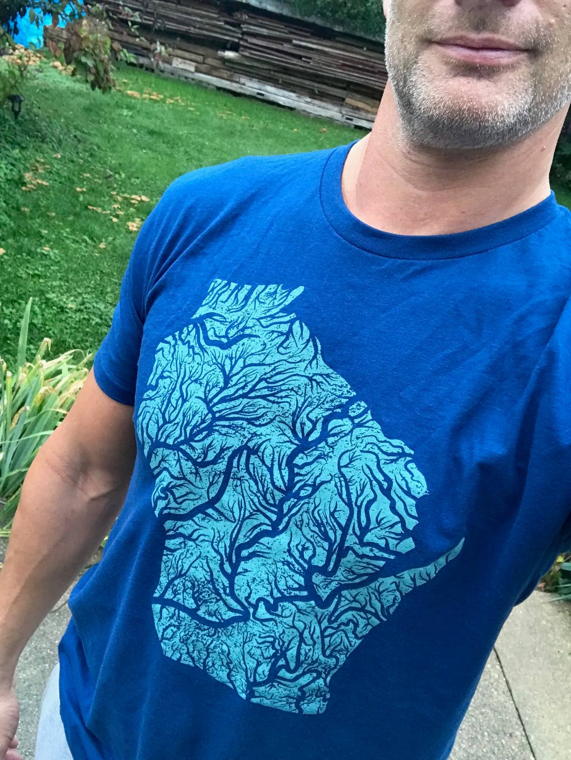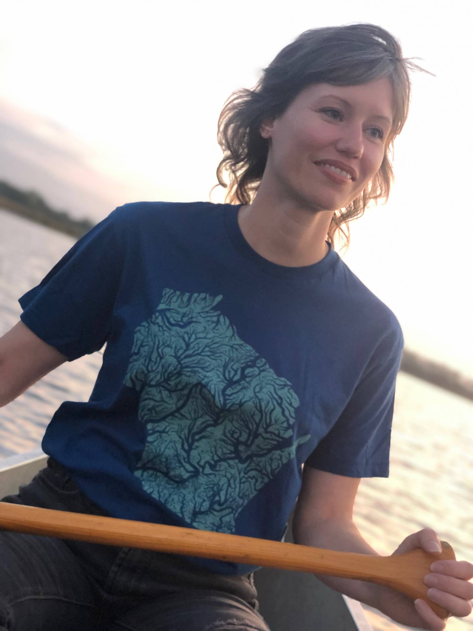 FOR Wisconsin BY Wisconsin IN Wisconsin Remember when you learned how to paddle a canoe? Remember learning how to cast your new Snoopy fishing pole with dad in the backyard? These are the best days of our lives. Celebrate the beauty of Wisconsin’s waterways with this locally printed stylized map of our great river system. 100% Cotton Next Level Apparel. The kind you want to wear! Aqua print on Indigo. This garment may shrink a half size if dried in a dryer.