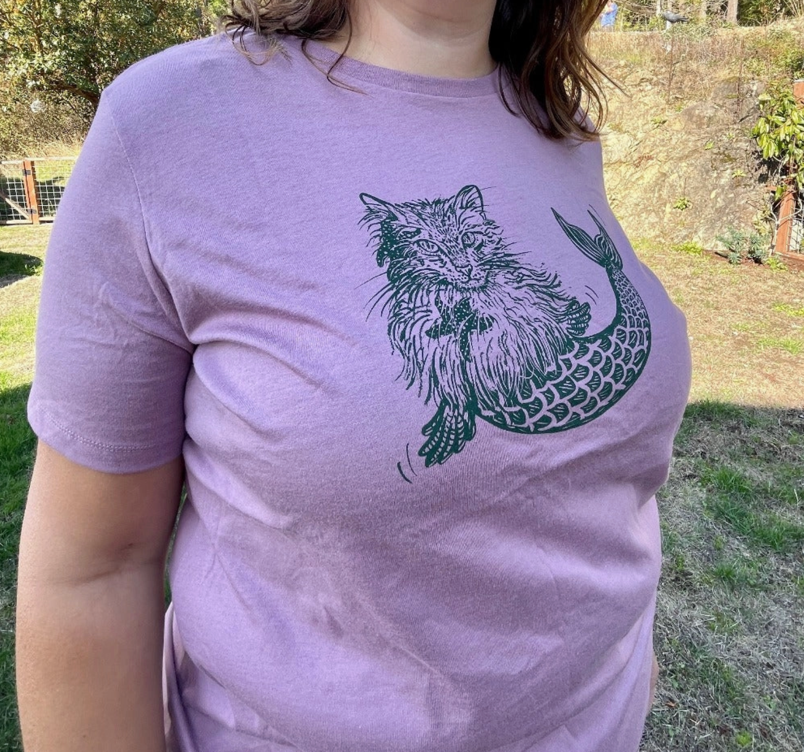 Unleash your inner mer-cat with this hand-drawn, USA made tee. Featuring a playful combination of mermaids and kitties, this relaxed fit tee is perfect for any quirky and fun-loving woman!