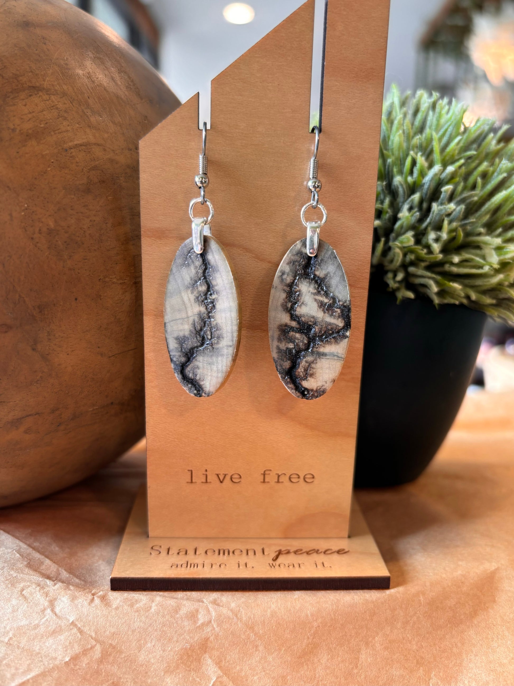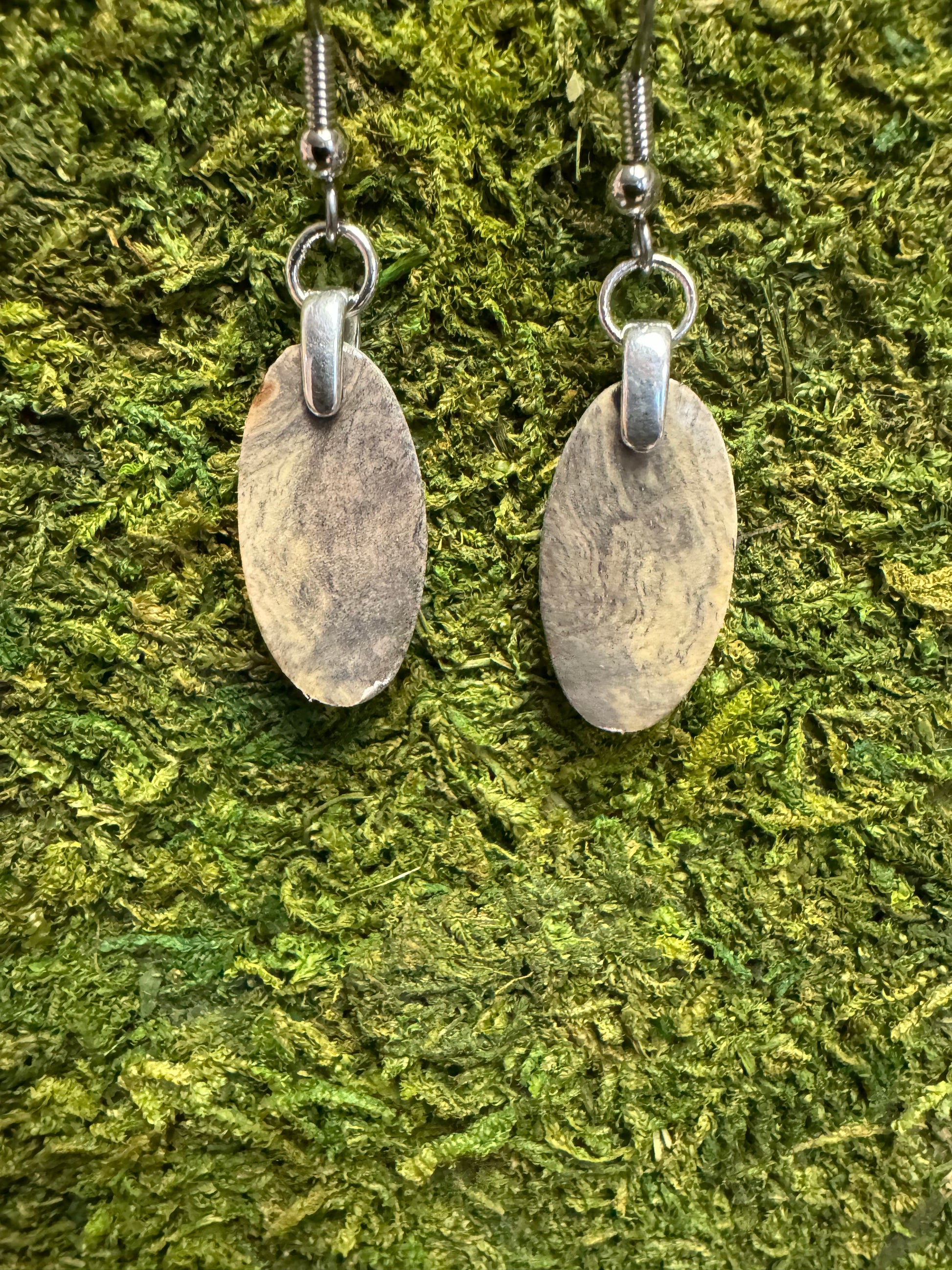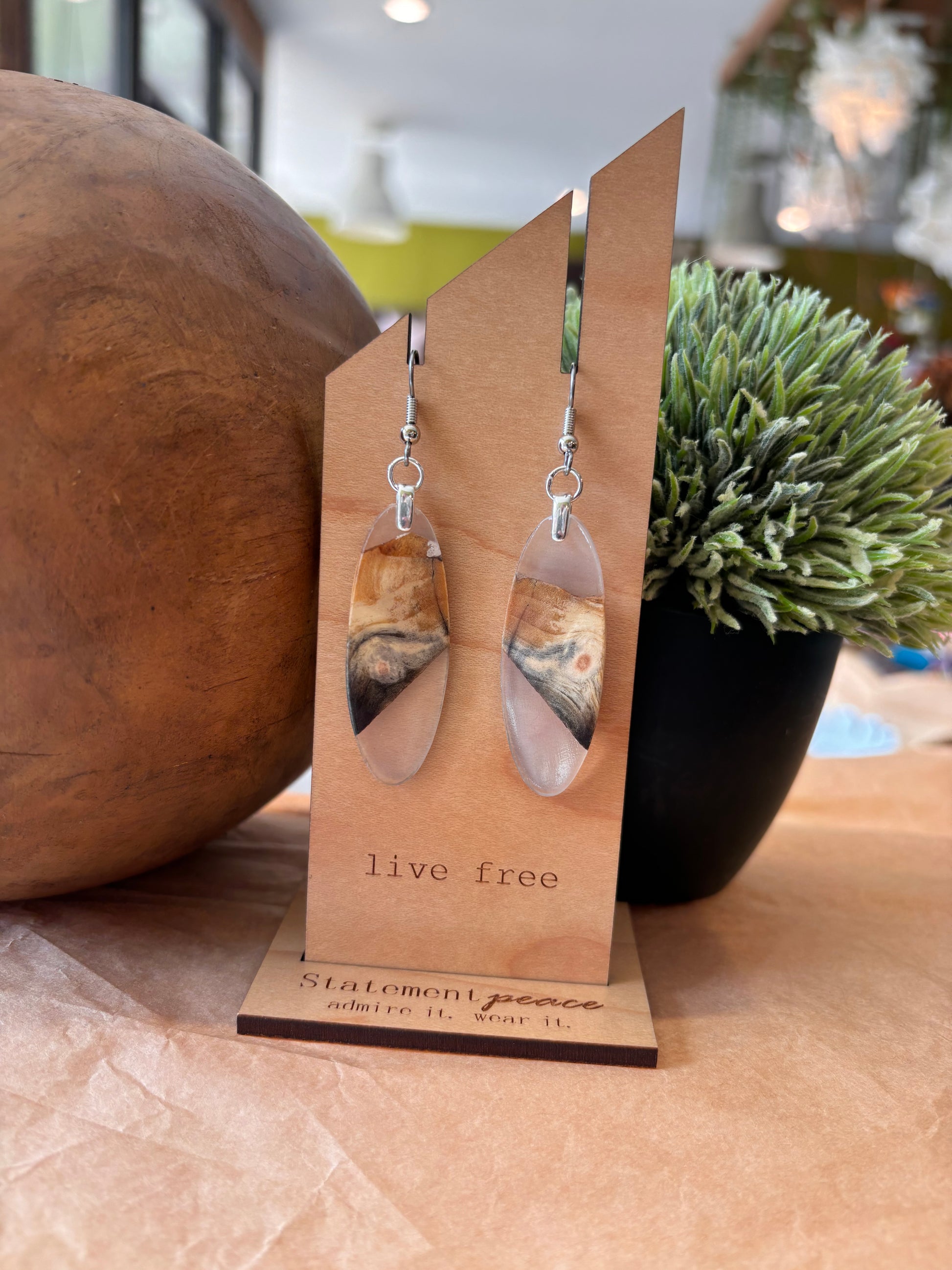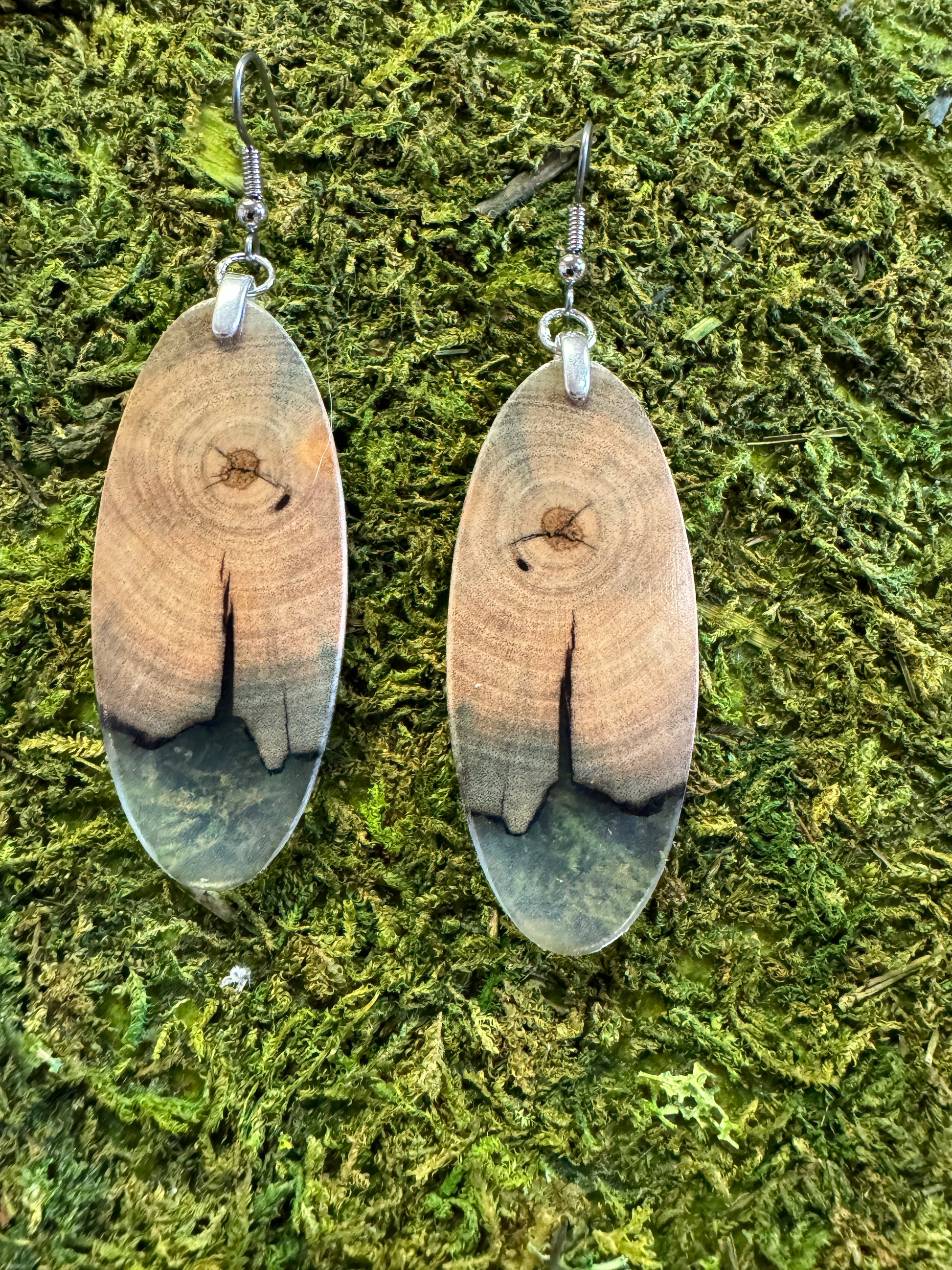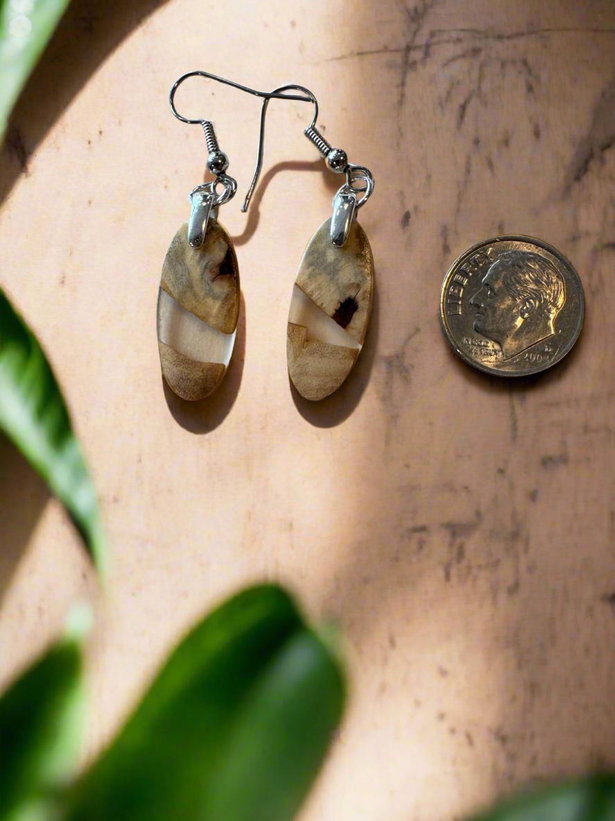 Custom KEPS exclusive! These earrings are incredibly beautiful and made from wood, resin, infused woods and many unique finds. They have sterling silver findings and surgical stainless steel hypoallergenic ear wires.