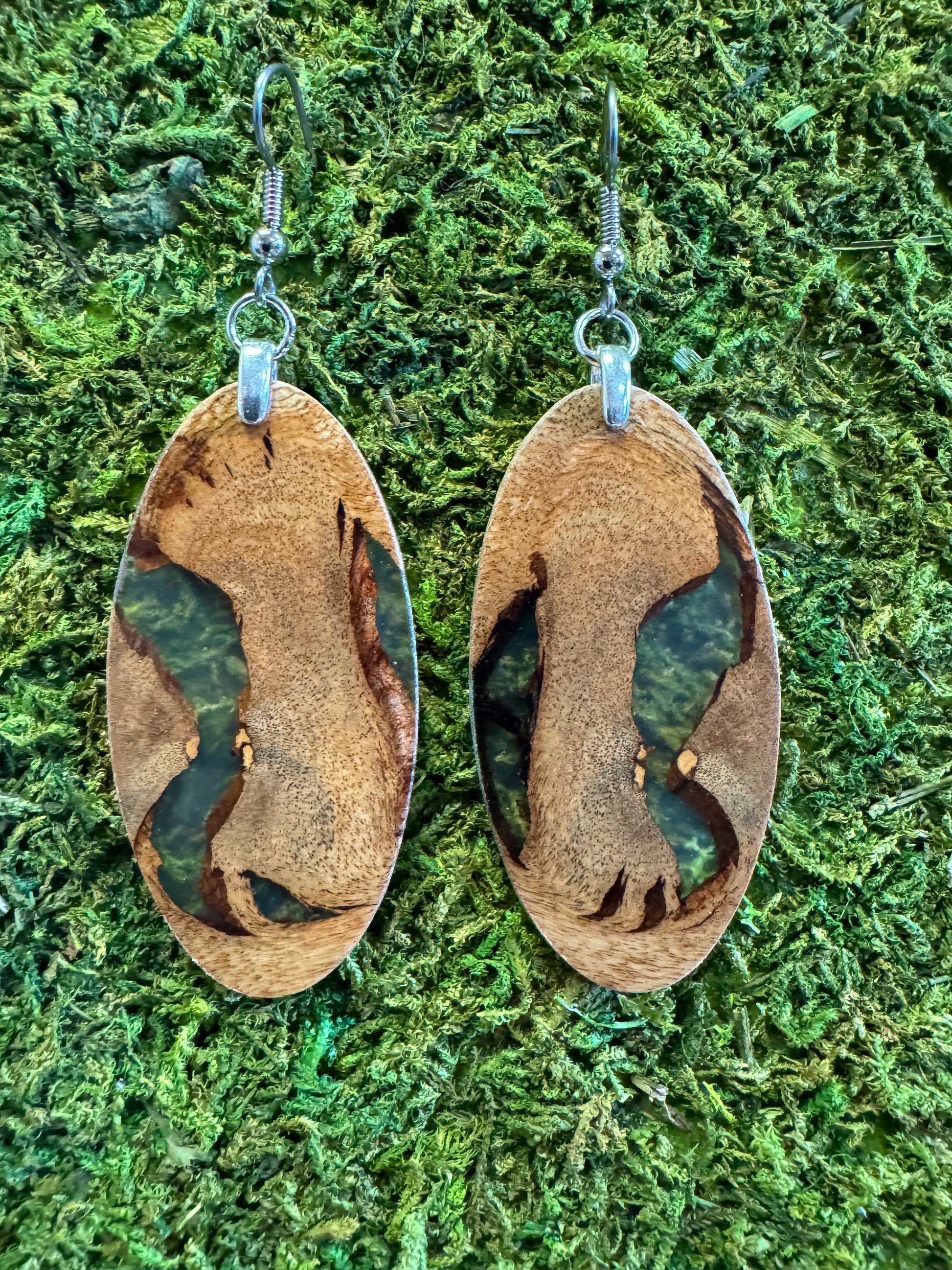 Custom KEPS exclusive! These earrings are incredibly beautiful and made from wood, resin, infused woods and many unique finds. They have sterling silver findings and surgical stainless steel hypoallergenic ear wires.
