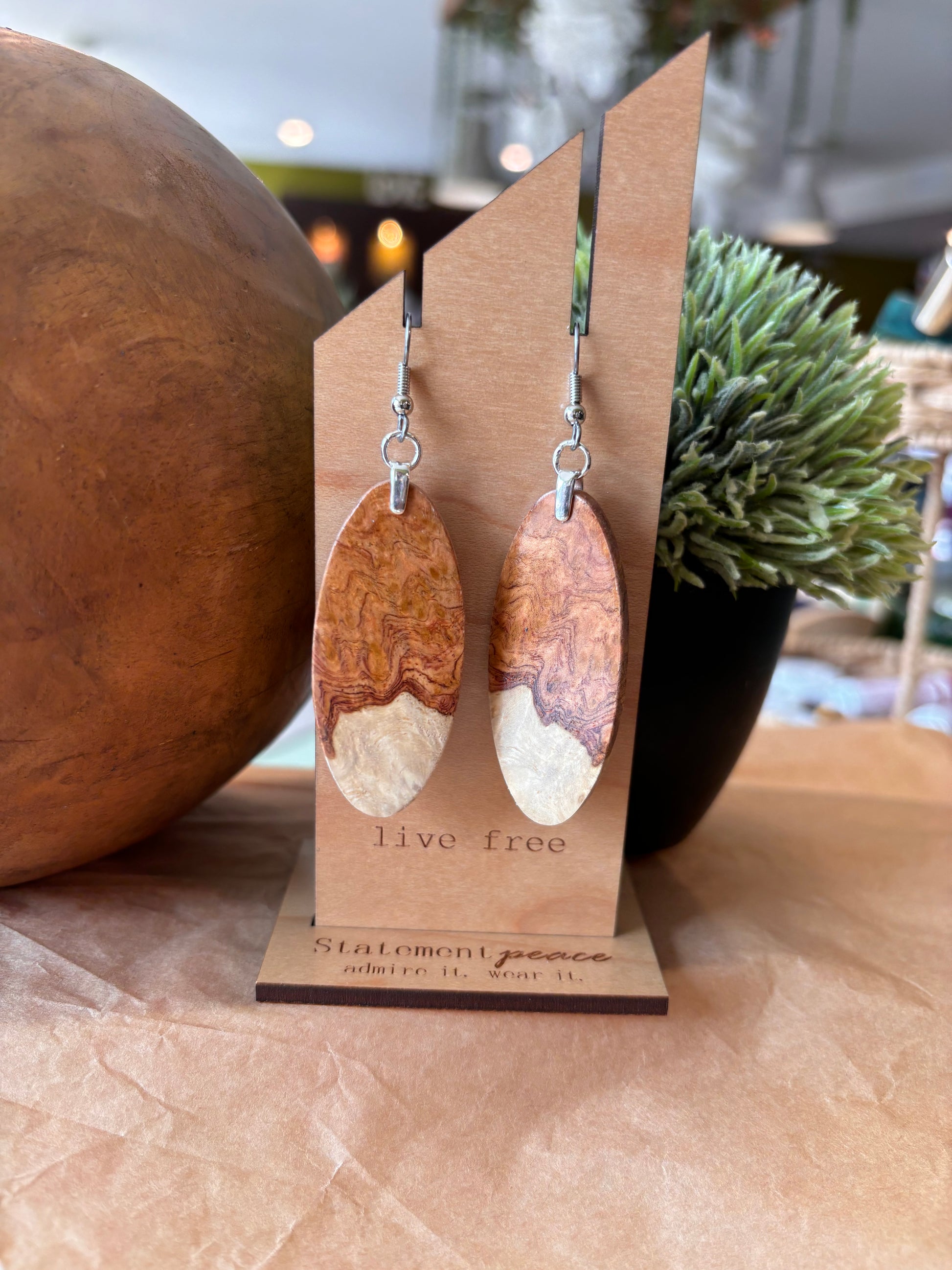 Custom KEPS exclusive! These earrings are incredibly beautiful and made from wood, resin, infused woods and many unique finds. They have sterling silver findings and surgical stainless steel hypoallergenic ear wires.