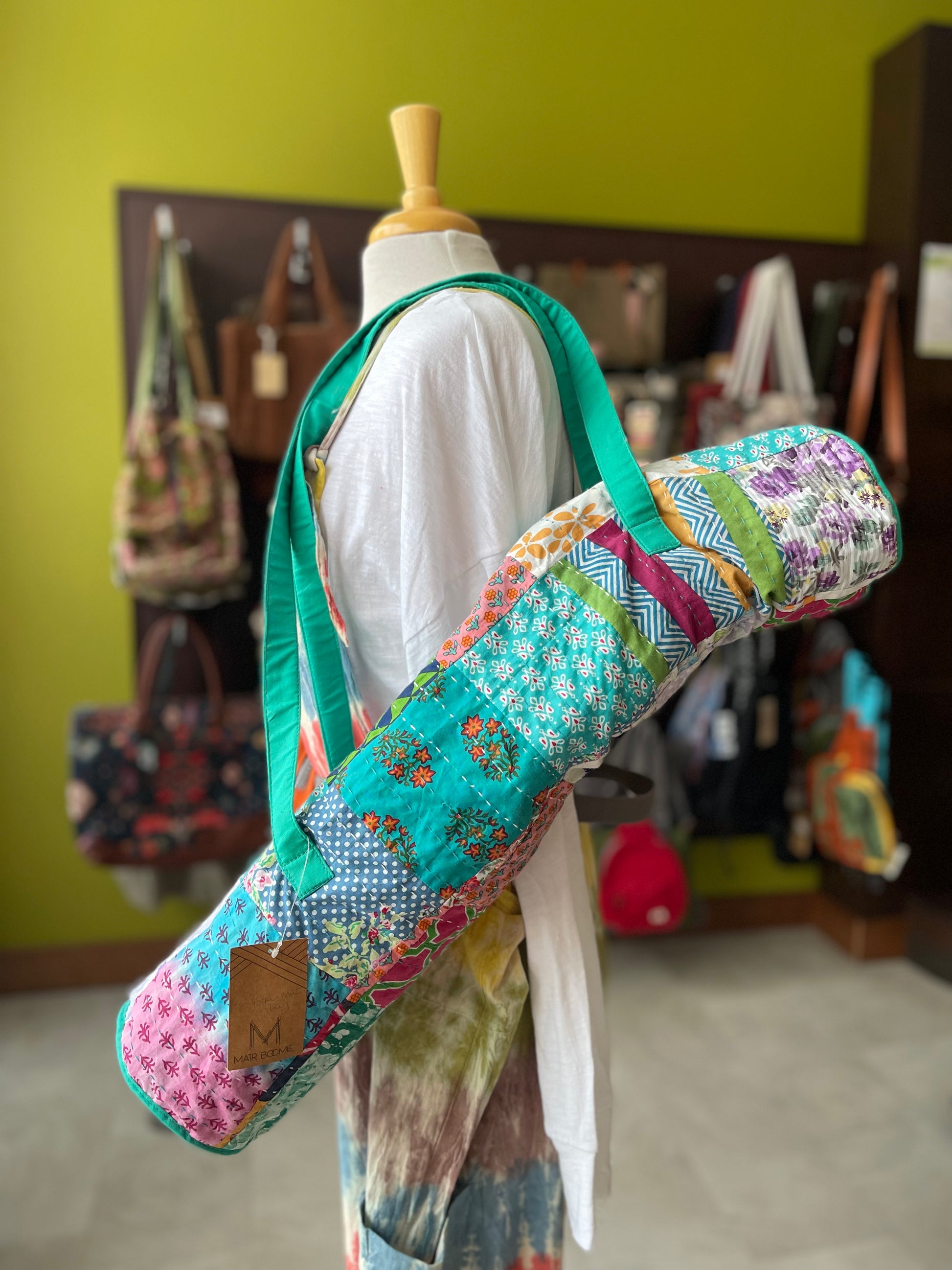 This beautiful patchwork yoga mat bag will fit any standard size mat with enough room to shove your workout clothes in too!